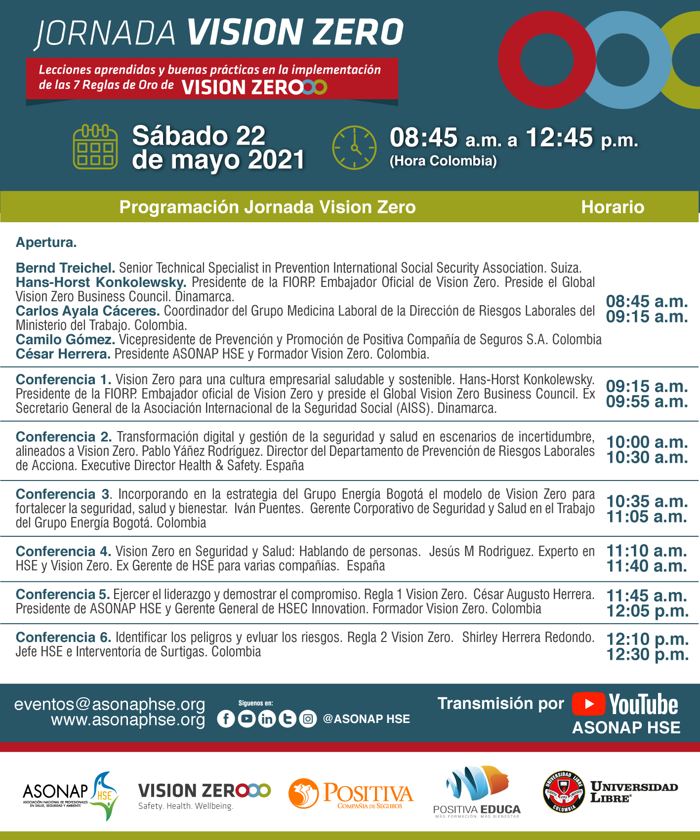 JORNADA VISIÓN ZERO 2021 - PROGRAMACIÓN Published: Aug 2023 Author Asociación Nacional de Profesionales en Salud, Seguriad y Ambiente, Colombia CHOOSE LANGUAGE Español